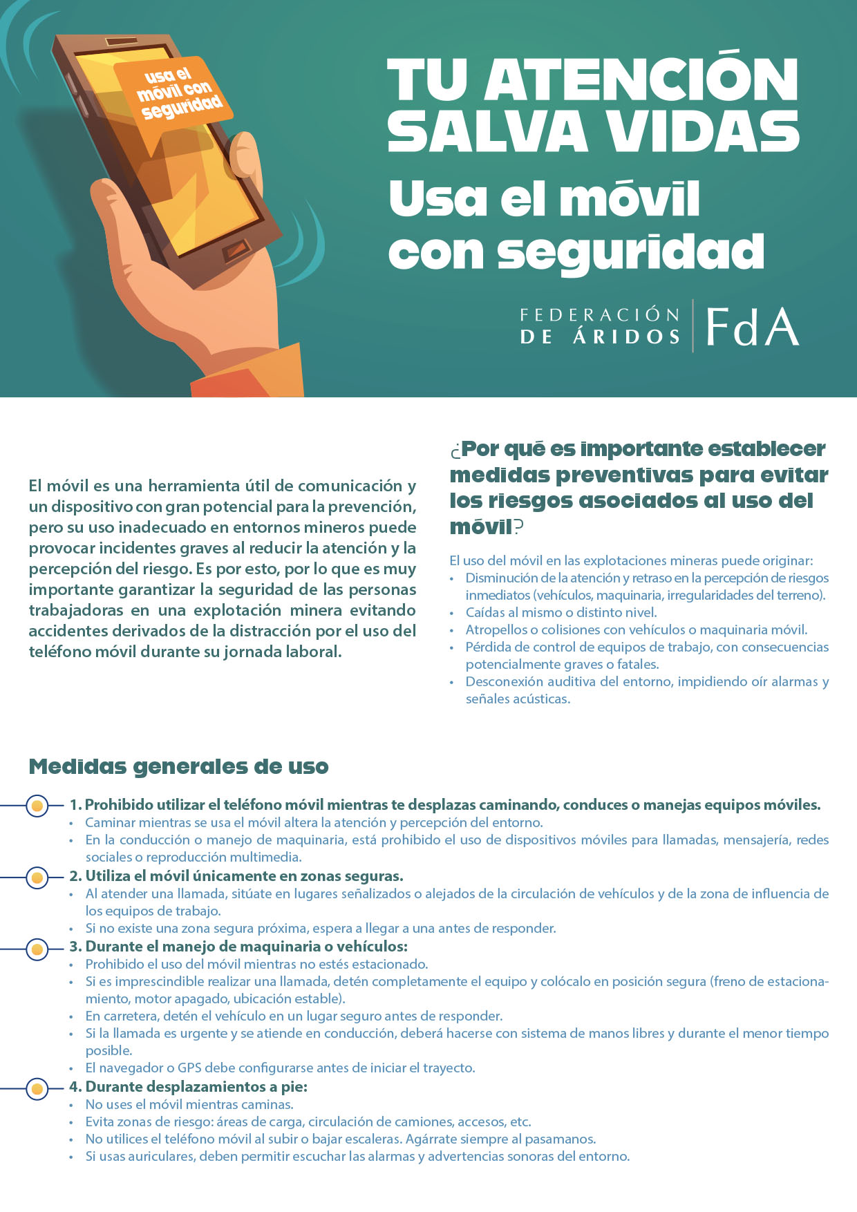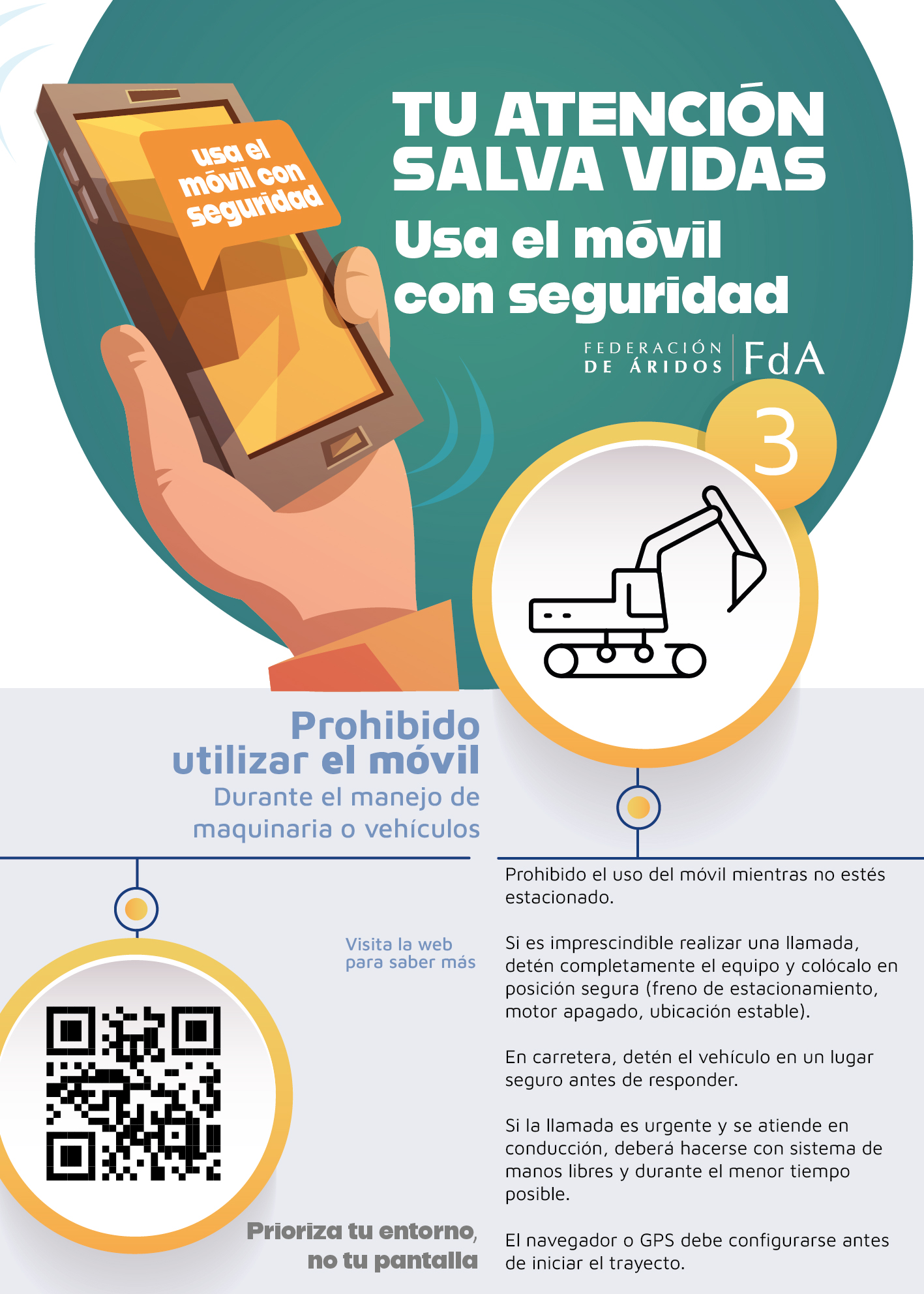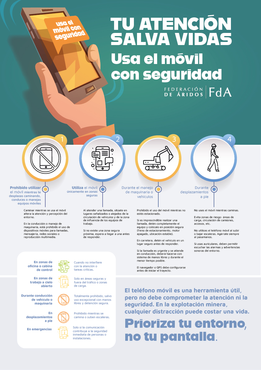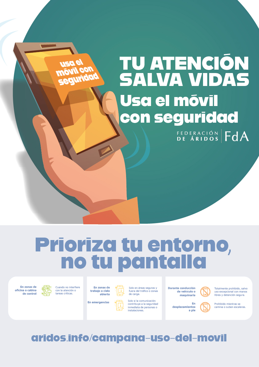 El objetivo principal de la campaña es concienciar y proporcionar criterios prácticos para que el uso del teléfono móvil en las explotaciones de áridos se realice de forma segura, responsable y compatible con la actividad productiva. En concreto, se pretende: