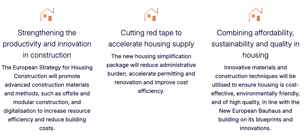 El Plan tiene como pilares la creación de más vivienda asequible, sostenible y de calidad, y la movilización de inversión pública y privada para transformar la producción y el acceso a la vivienda en toda la UE. Entre sus medidas figuran:
